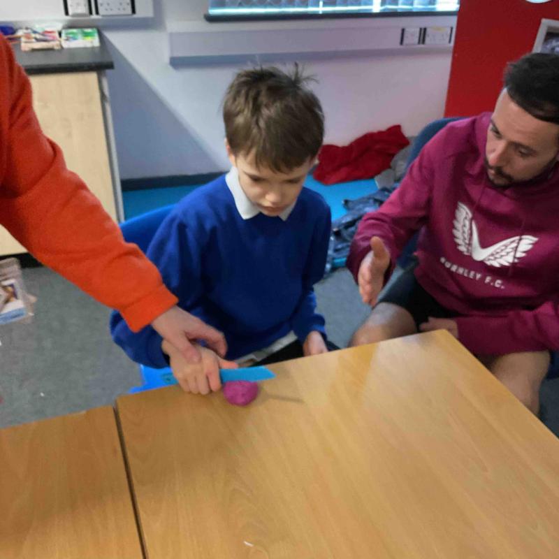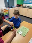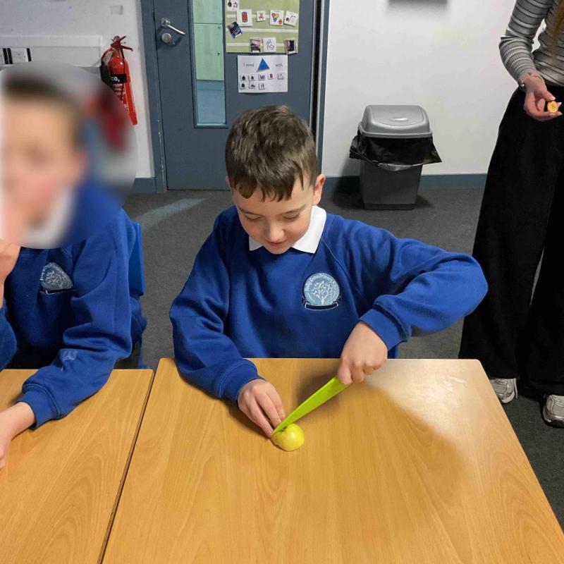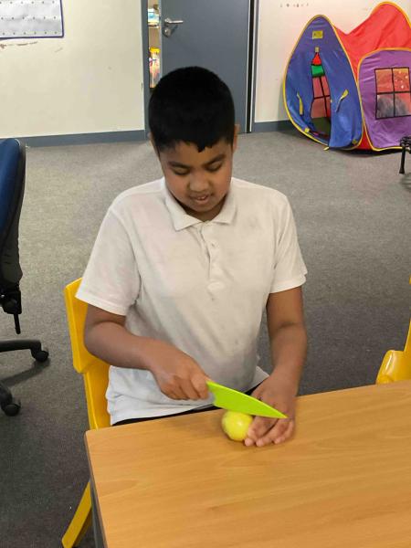 In Maths this term, we had a week learning all about fractions. We started by focusing on 'halves' and how the variety in which they can be represented. The class demonstrated their learning by halving shapes during some outdoor learning (it didn’t rain for once!). We reinforced this by carefully cutting our fruit in to two equal parts at snack times throughout the week!