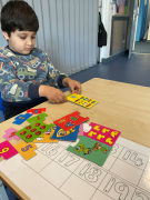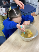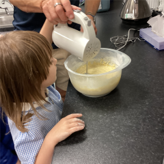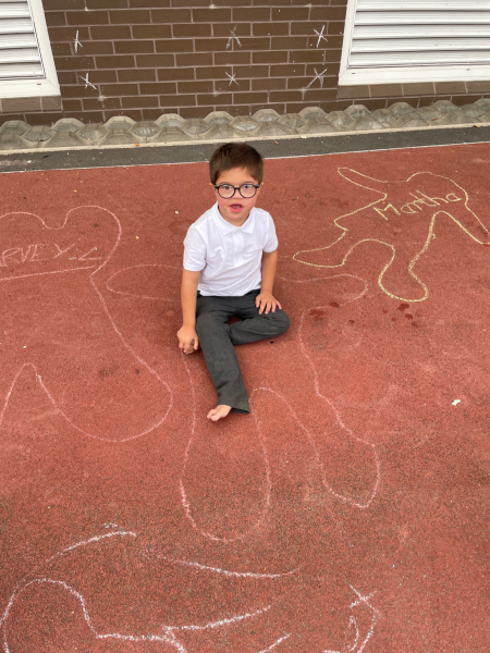 This term in Adam’s class we have been looking at the story Funny Bones. We have explored the Forest school by building dark dens and enjoying the different areas. Linking to the story we have also been looking at our bodies, where we have used mirrors to pull faces, drawn around our bodies on the yard and labelled the different parts. Together with this we have enjoyed baking and cooking making yummy treats such as gluten free banana bread and fruit kebabs.