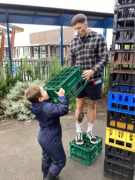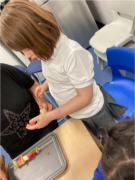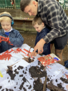 In Maths, we are looking at long, short, tall and small. We went into our outside classroom and used lots of different materials to make long and short things to walk on and we painted long and short lines using mud, sticks and paints! As you can see we had lots of fun!
